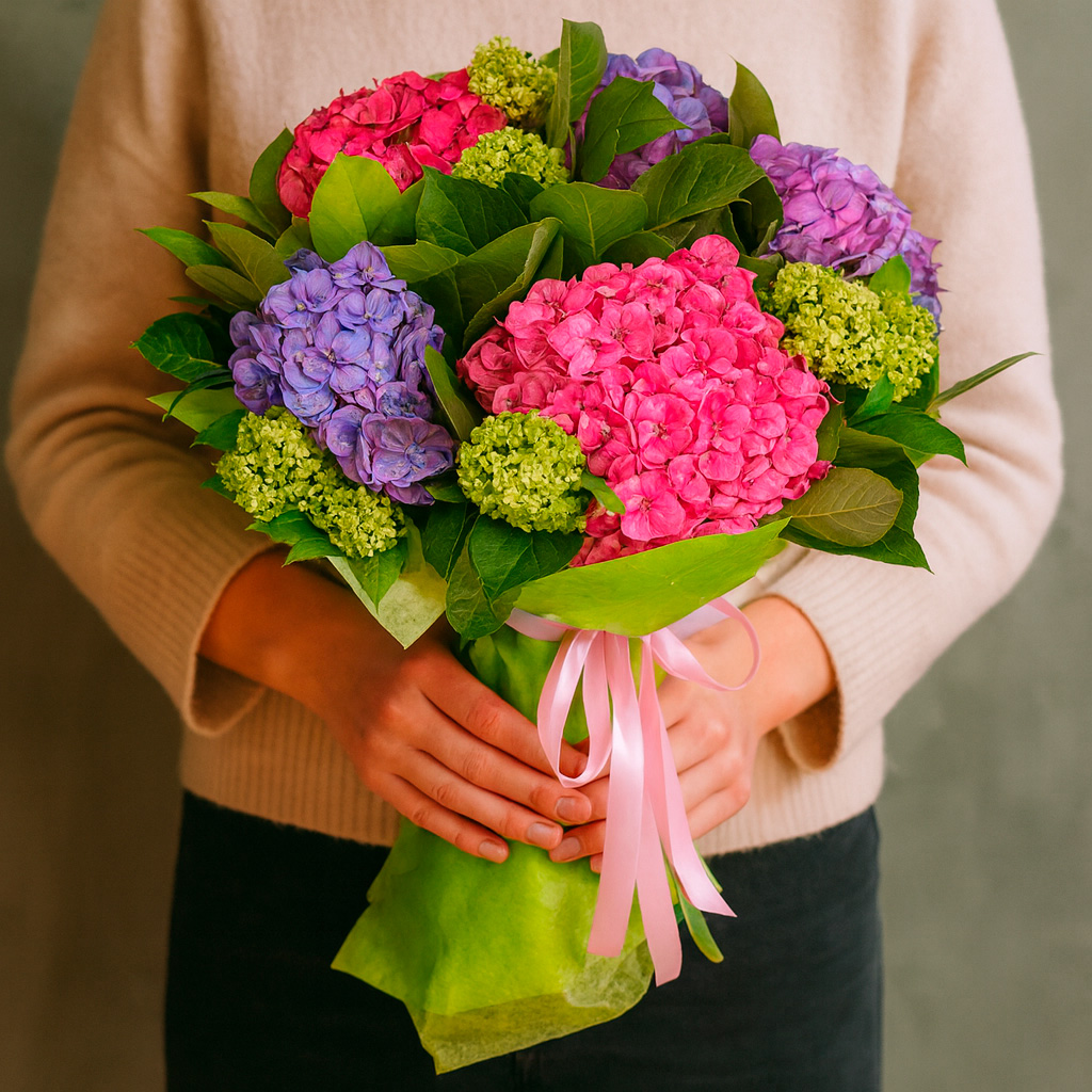 Яркий букет из розовой, зеленой и фиолетовой гортензии создает настоящий праздник цвета. Упакован в нежную зеленую матовую пленку и перевязан розовой атласной лентой. Возможны альтернативы оформления: крафт-бумага или декоративная сетка. Прекрасный подарок для любимой на день рождения или годовщину.