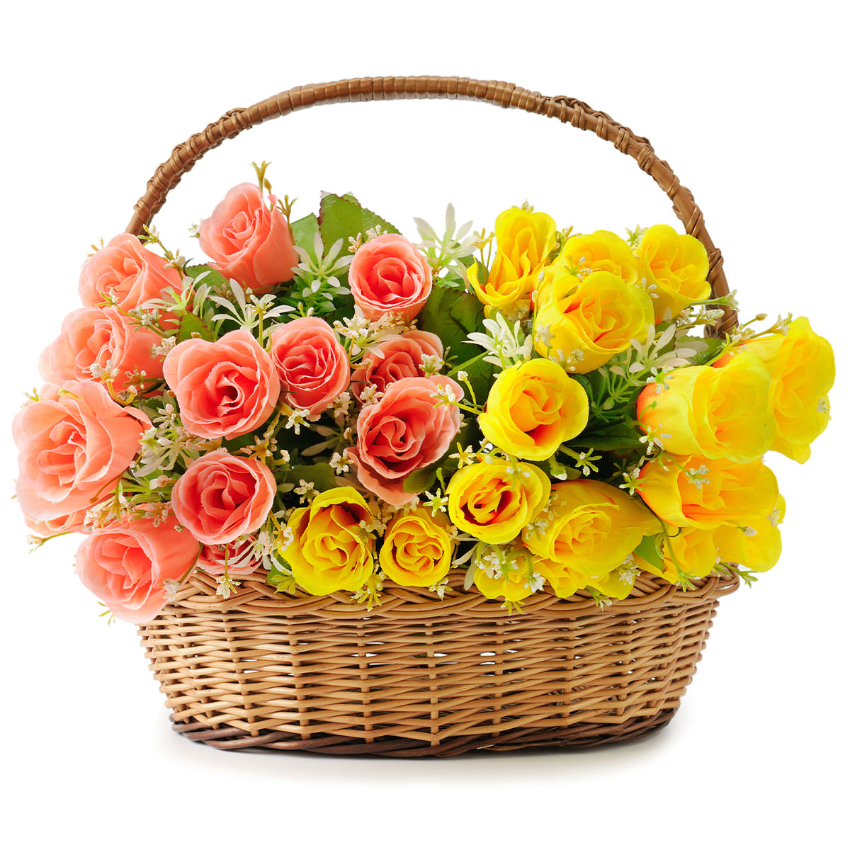 Эта цветочная композиция сочетает в себе розовые и желтые одноголовые розы, дополненные свежей зеленью. Корзина выполнена из натурального материала, что придаёт ей естественный и изысканный вид. Для альтернативного оформления можно выбрать плетёную корзину или корзину из лозы. Подходит для поздравления на день рождения или для любимой.