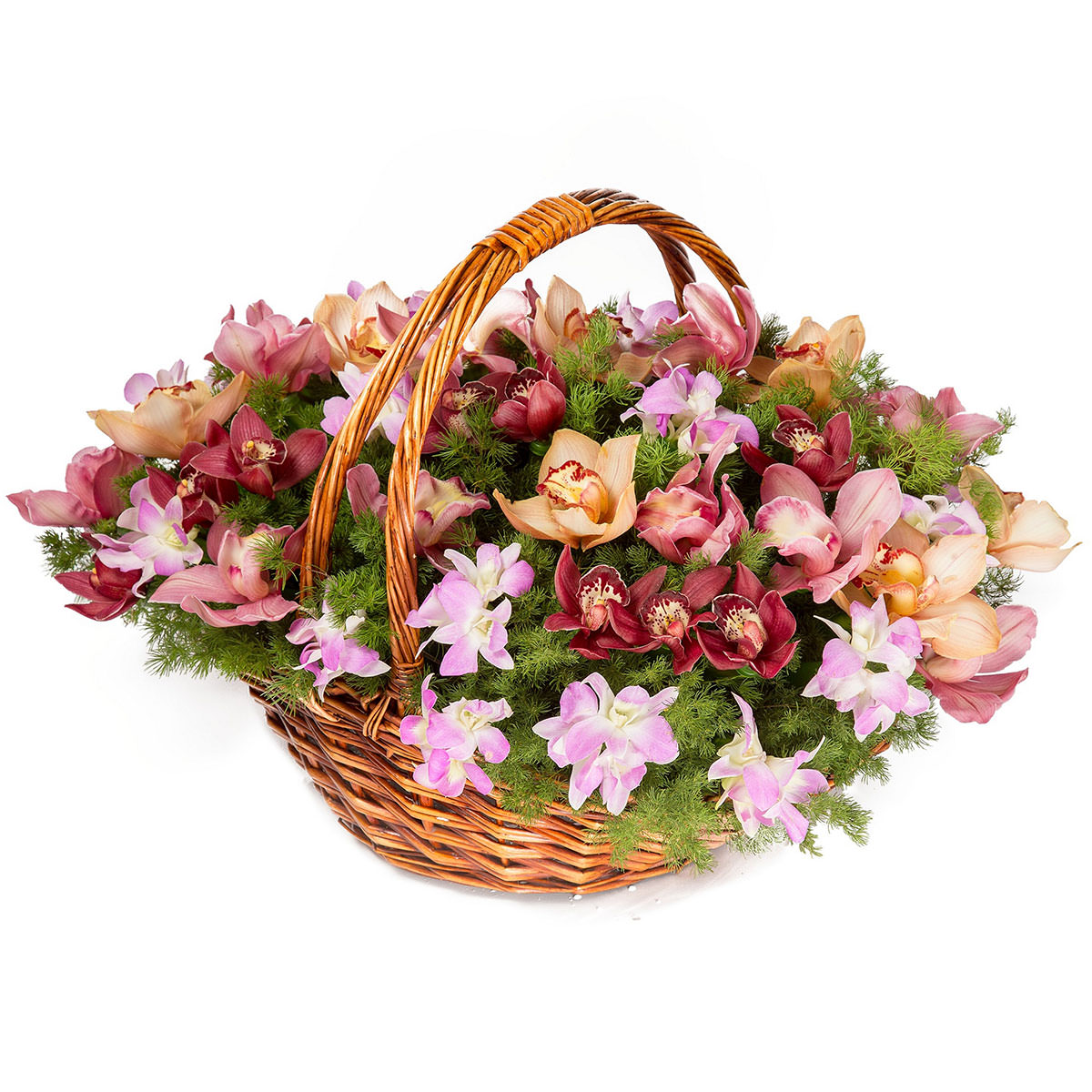 Орхидеи разных оттенков создают яркую и живописную композицию. Плетёная корзина придаёт естественность и изящество. Возможны альтернативы оформления: корзина из лозы или с тканевой отделкой. Прекрасный подарок для любимой на годовщину или на День матери.