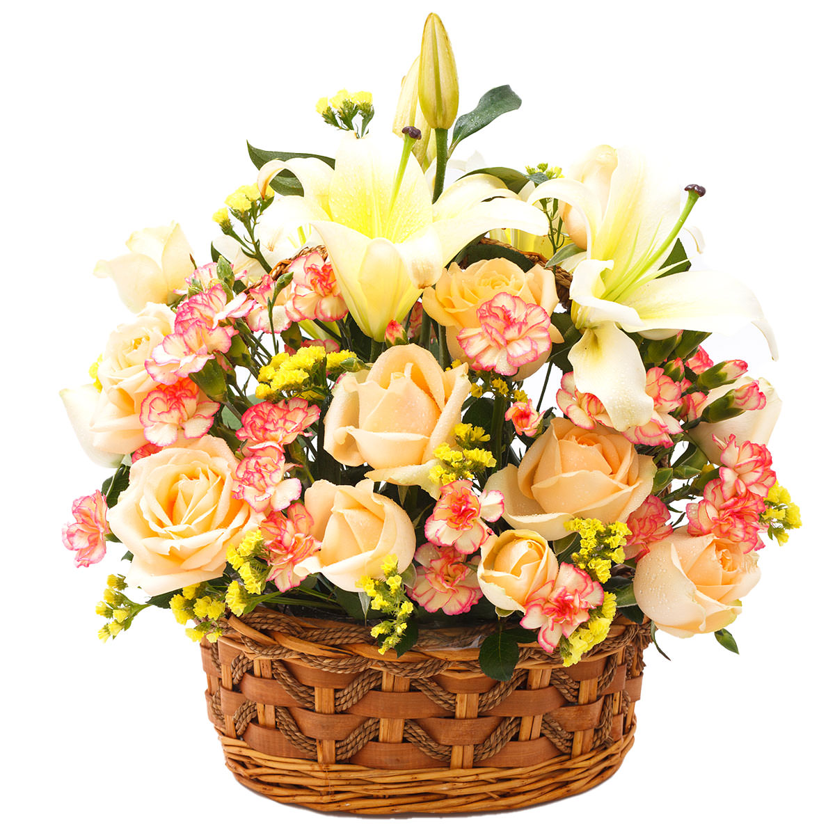 Изящная композиция из кремовых роз, белых лилий, мини-гвоздик розового оттенка и жёлтой статицы создаёт атмосферу нежности и утончённости. Цветы аккуратно расположены в плетёной корзине, что придаёт композиции естественность и шарм. Возможны альтернативные оформления с корзиной из лозы или ротанга. Прекрасный подарок для любимой на годовщину или день рождения.