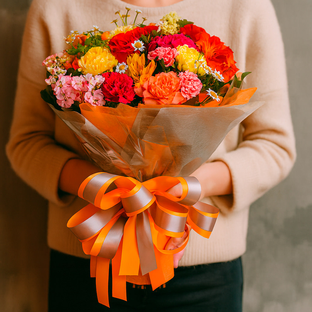 В этом букете сочетаются красные розы, розовые и кремовые гвоздики, желтые и красные альстромерии, розовая маттиола и нежные ромашки. Упакован в матовую пленку и перевязан яркой оранжевой лентой. Возможны альтернативы упаковки: крафт-бумага или декоративная сетка. Прекрасный подарок для любимой на день рождения или годовщину.