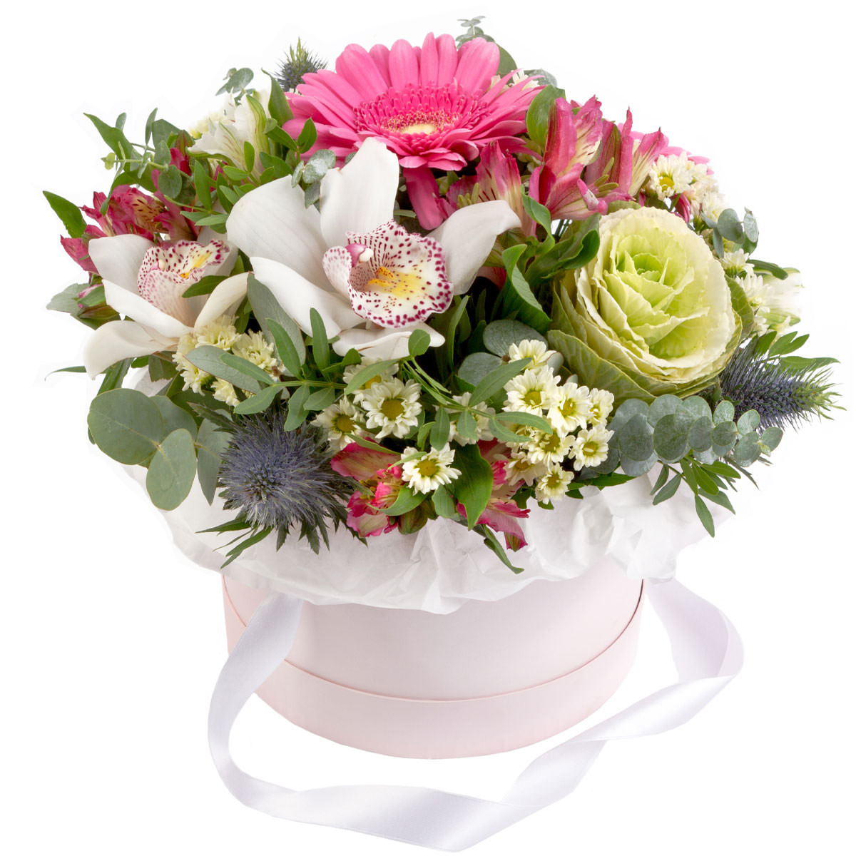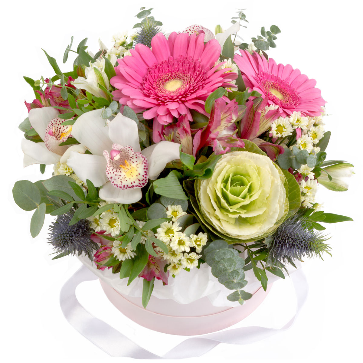 Белоснежные орхидеи и розовые герберы создают яркий акцент в композиции, дополненной декоративной капустой и мини-хризантемами. Альстромерии и эрингиум придают букету изысканность, а эвкалипт добавляет свежести. Композиция оформлена в элегантной шляпной коробке нежно-розового цвета. Возможны варианты оформления в бархатной или атласной коробке. Прекрасный подарок для любимой на годовщину или день рождения.