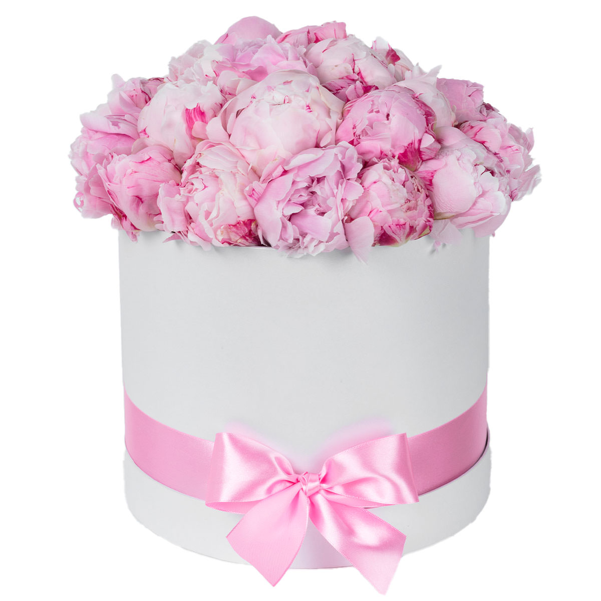 Розовые пионы создают нежную и романтичную композицию, которая очарует с первого взгляда. Цветы аккуратно расположены в белой шляпной коробке, украшенной атласной лентой в тон. Возможны варианты оформления в бархатной или дизайнерской коробке. Прекрасный подарок для любимой на день рождения или 8 марта.
