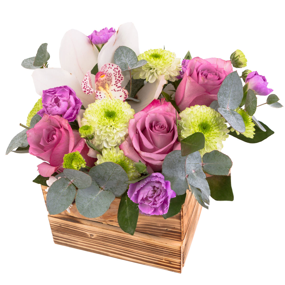 Элегантная композиция из белой орхидеи, розовой одноголовой розы, зеленой кустовой хризантемы и сиреневой гвоздики, дополненная свежими листьями эвкалипта. Цветы аккуратно расположены в деревянном ящике создавая гармоничную цветовую палитру. Возможны альтернативы оформления: корзина из лозы или ротанга. Прекрасный подарок для мамы на день рождения или юбилей.